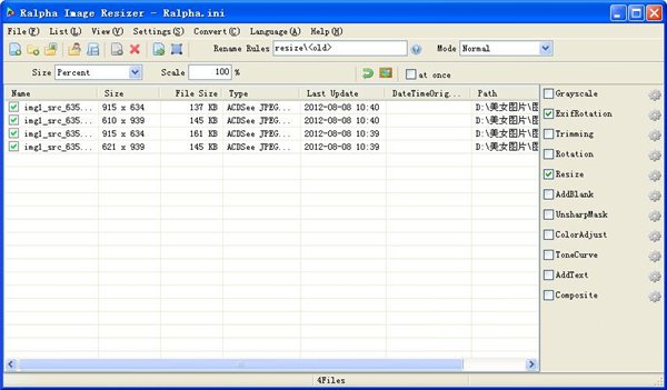 批量图片调整(Ralpha Image Resizer) 130106 绿色版 Ralpha Image Resizer是一款批量图片调整工具,可以用它来批量调整大小的照片。该图片调整工具采用不同的算法提供了多个过滤器,包括UnsharpMask,ToneCurve,ColorAdjust,复合材料,AddText等。并且支持多种文件格式,如JPEG,TIFF,PNG,BMP,GIF,ICO,JPEG XR的输入和JPEG,PNG,BMP输出。
