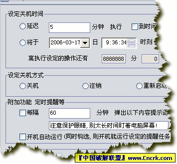 Easy定时关机 V2.5 绿色版 Easy定时关机精灵 是一款运行于Windows系统的定时关机得力助手。具有延迟一定时间或在设定的时间执行关机、重新启动、注销功能;此外还有开机自动运行,定时提醒和关机倒计时显示的功能。软件界面漂亮友好,简单易用。此为免费绿色软件,无须安装可直接运行,欢迎使用!