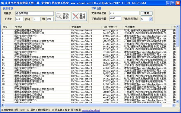 斗波百度豆丁文档下载器 1.0 绿色版 斗波百度豆丁文档下载器,只需要输入文件名关键字,再输入文件扩展名,然后点击搜索,然后,然后就列出互联网上海量的文档。使用斗波word文档下载器什么论文啊,什么计划书啊,什么策划书啊,统统可以免积分下载。