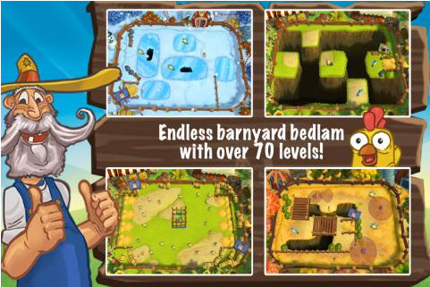 游戏的基本目标就是把小鸡、小羊、小牛赶回它们的窝,在回窝的路上,有三颗星星,吃到这三颗星星才算完美过关。游戏的难度随着关卡的提升而增加,在上手后大家会发现,这款可爱搞笑风格的游戏真的很难。玩家驱赶家畜回窝的方法比较特殊,需要在它们屁股后面,向你想要去的方向滑动。