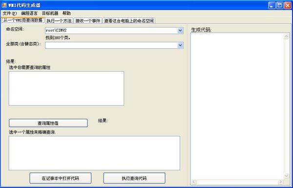 WMI代码生成器(WMI Code Creator) 1.0 中文版 WMI Code Creator是微软提供的一个WMI代码生成工具。利用WMI代码生成器可以执行查询或者执行一个方法等,还可以查看当前或者远程电脑上的命名空间以及其下的类,并且还可以生成相关的代码(不然就不叫WMI代码生成器了),支持生成的代码类型包括VBS、C#及VB.NET,默认生成的代码是VBS。