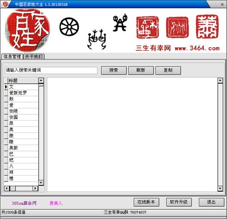 中国百家姓大全是一款绿色版的百家姓查询软件。《百家姓》是一本关于中文姓氏的书,成书于北宋初。原收集姓氏411个,后增补到504个,其中单姓444个,复姓60个。