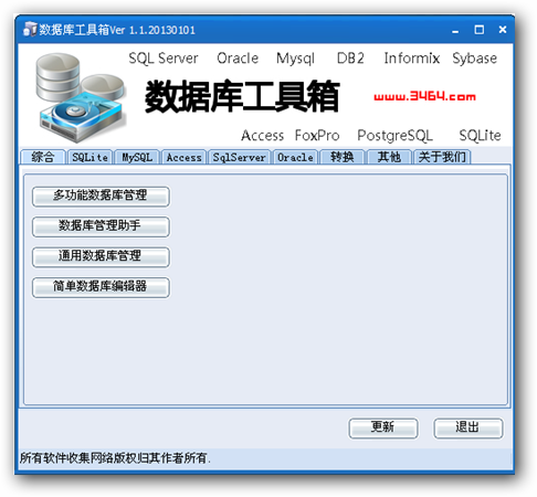 数据库工具箱集成了常用的各种数据库管理工具(如:mysql,access,mssql,sqlite 等),以及辅助工具。