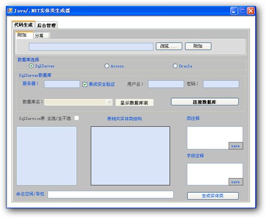 java/.net实体类生成器,可以自动生成从sqlserver数据库中生成java 和.net的实体类。解决因为vs2008里自带的代码重构功能中的封装字段,一次只能封装一个字段,一定程序造成程序员的重复性工作。