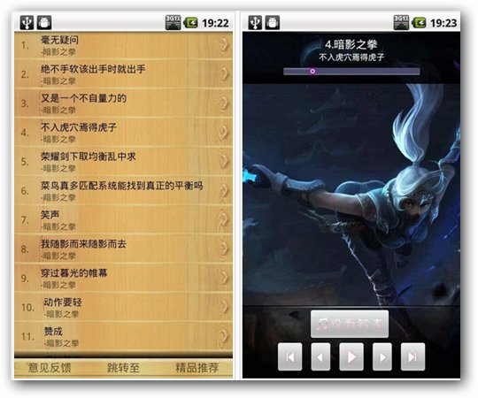 英雄联盟人物铃声是火爆网游英雄联盟里的各英雄的特色语录而所做的铃声集合。各种搞笑,幽默,有趣的尽收其中。您可以用来当做您的闹钟铃声,短信通知铃声以及电话铃声等。