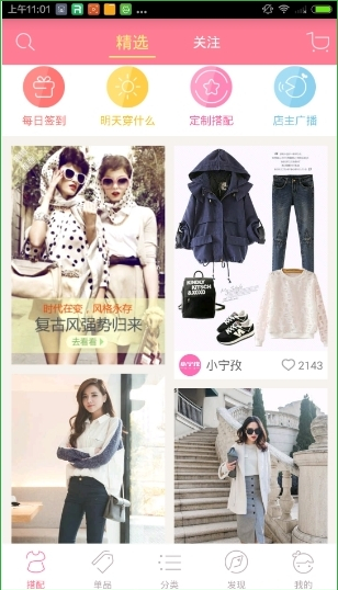 每天凌晨时尚速递的发现模块会自动更新20个搭配,每天20个,看完即止。如果要找想要的某一类搭配,可点击右上角的“分类”按照单品去检索