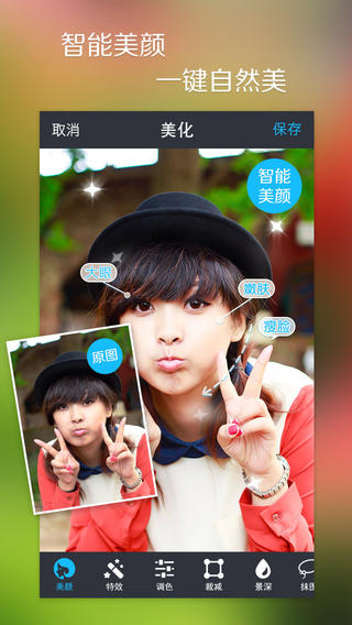美肤、美型滤镜,美白光滑皮肤、大眼,瘦脸任意调节,