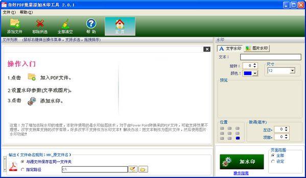 奇好PDF批量添加水印工具是一款为您的PDF文件添加水印(可添加文字、图片水印)的免费软件。