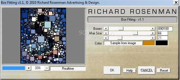 随机格框PS滤镜插件(Box Fitting),一个方便和易于使用的photoshop插件,旨在帮助用户生成随机装框。从主界面,用户必须设置想要的盒数,大小和颜色的可能性。然后,他们可以很容易地调整他们的图像和专用的左面板中预览。