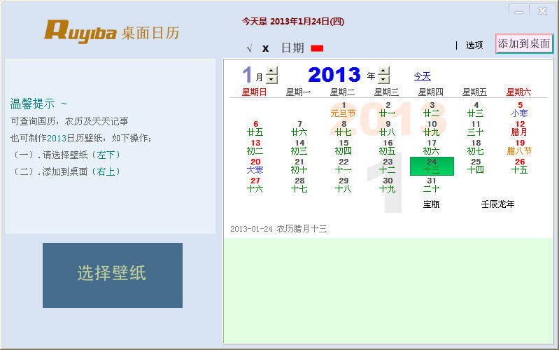 Ruyiba桌面日历,方便查询国历,农历,星座及记事功能。也可将日历半透明的镶在任意你所喜爱的桌面背景图象上,制作成2013日历壁纸,简单二步骤不占用电脑资源及内存。