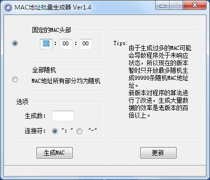 批量生成MAC地址,最多随机生成99999条随机MAC地址。因为有时候需要用到大量MAC地址,这个工具可以批量生成收1资源分纯粹是为了防止某些“不劳而获”的人。