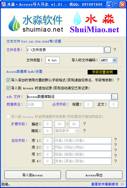 水淼Access导入导出器 v1.01 绿色版 水淼Access导入导出器一款免费的txt和mdb互转工具,将Access数据库的记录导出到文本文件,或将文本文件导入到Access数据库记录(可做文章入库之用)。