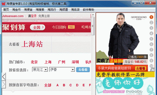 淘便宜专家 V1.1.0 绿色版 淘便宜专家系列软件旨在为广大淘宝买家提供一个合理优惠最大化的购物工具,淘便宜软件提供了众多优惠折扣的搜索方法,搜集了大量优惠频道, 集合并不断更新最全面的淘宝特卖、打折、促销、秒杀商品网购向导服务,让广大淘友购物更方便、更快捷、更便宜。