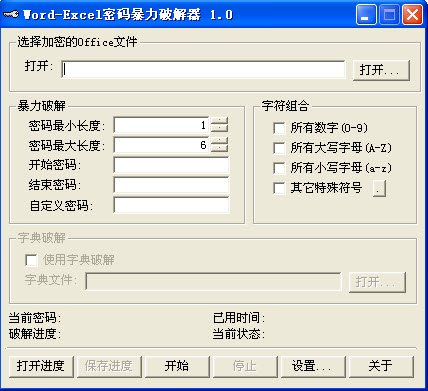一个Excel文档密码破解工具,主要用于Word文档和Excel文档,支持doc和xls两种文件格式,密码支持数字、字母和特殊符号,可以自定义密码字符、密码最小长度、密码最大长度、开始密码和结束密码。软件共有两种打开方式:一种是暴力破解,另一种是字典,字典打开需要相应的字典文件(txt文件);打开过程中可以暂停,并且能够保存打开进度。