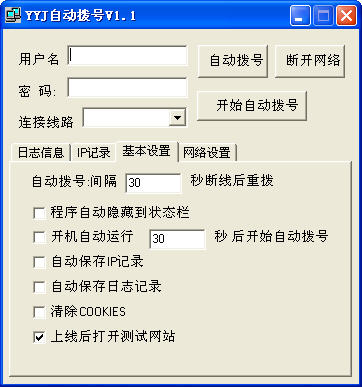 YYJ自动拨号是一款自动拨号上网软件,有自动拨号、自动断线换IP等功能,选择连接线路,里面的选项是系统已存在的拨号连接,按界面提示,就能设定其他运行参数。新版本中改写了日志信息的保存方式,ping记录独立保存为1个文件,方便查看网络质量。