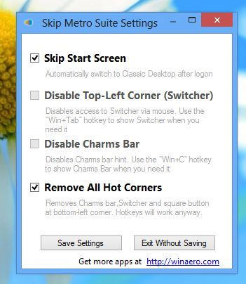 这个小程序可以将Windows 8直接启动到经典桌面。Skip Metro Suite可以跳过开始屏幕,使系统直接启动到Windows经典桌面。程序还可以禁用左上角的切换器,Charm Bar以及所有热区