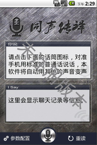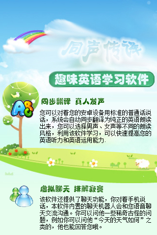 同声传译是一款英语教学软件,安装本软件后,您可以对着您的安卓设备用标准的普通话说话,系统会自动同步翻译为纯正的英语朗读出来,您可以选择男声、女声等不同的朗读风格,利用该软件学习,可以快速提高您的英语听力和英语运用能力。另外,同声传译也提供了变声模式,会将您说的话用广东话、四川话、山东话、儿童版、悲伤版等风格变声后复述出来。该软件还提供了聊天功能,你对着手机说话,本软件内置的机器人会和您直接进行语音聊天交流沟通。