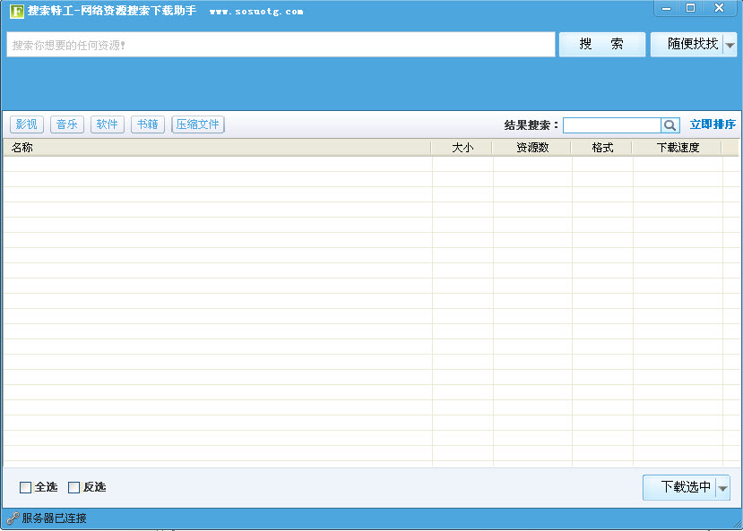 搜索特工-网络资源搜索下载助手是基于多项分布式集群文件搜索的网络文件查找辅助下载工具,通过HTTP、ED2K、P2P网络对各类资源进行扫描、收集、有效性验证,从而实现互联网络文件只要存在,就可以被找到和轻而易举的下载。目前支持各类正版高清大片、各类电影、音乐、小说、文档、公司报告、论文等下载,且完全免费。