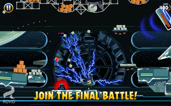 加入AngryBirds传说中的StarWars?(星球大战)最强冒险!乘着胖猪军队从Tatooine(塔图因)的沙漠深处到胖猪死星的银河之旅时,用力挥动光影弹弓把胖猪军队炸飞-但是切记!你会面对可怕的DarthVader(达斯维达),胖猪军队的黑武士!你能成为绝地武士大师并给星系带来和平吗?