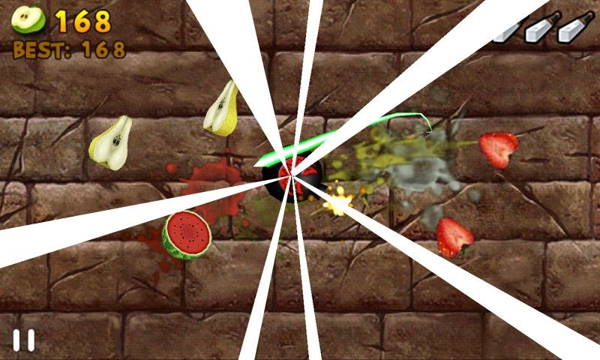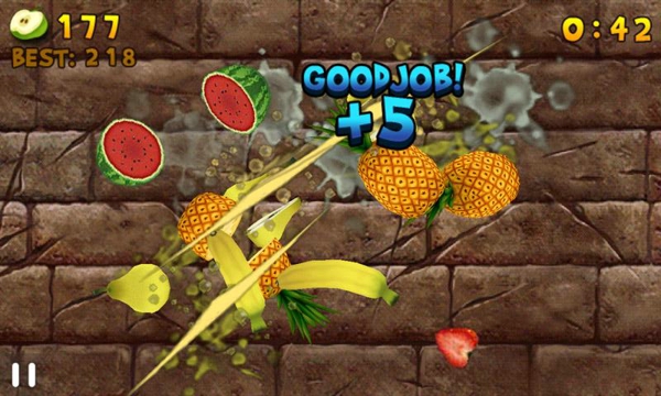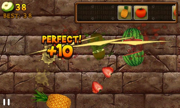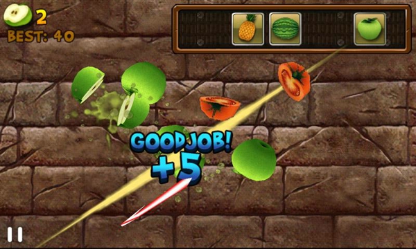 水果忍者作为一款简单有趣的游戏,上市以来大受欢迎,名列apple store畅销排行榜前十位。游戏画面做的非常的精致,切开不同的水果,会开看到不同颜色的鲜艳果肉,而且做得逼真,可以看到果核,肉纹。各种颜色的果汁飞溅到半空,或者飞溅到墙上,为玩家带来刺激的视角体验。【操作技巧】