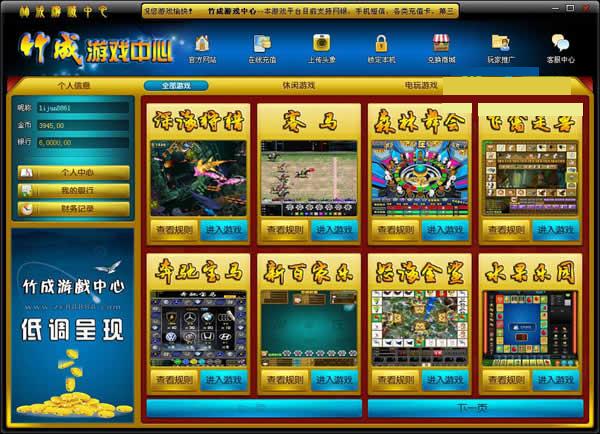 竹成游戏中心一款拥有全新视觉,集休闲娱乐、社区聊天于一体的网络在线游戏,平台以街机电玩类游戏移植为主,现提供深海捕鱼,森林舞会,赛马,怒海金鲨,奔驰宝马,水果机,飞禽走兽,欢乐斗地主等多款热门与游戏。