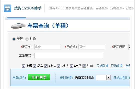 网站登不上?抢不到票?没精力定时抢票?用搜狗12306助手来帮您搞定吧!安装后将自动帮您登录网站,还可以自动刷票、定时刷票,第一时间抢到回家的车票。(搜狗12306助手暂只支持搜狗高速浏览器4.0以上版本)