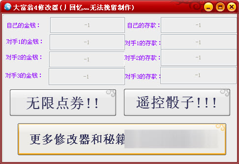 大富翁4万能修改器可以修改自己和对手的金钱数量,存款数量等。追加了遥控骰子和无限点券等作弊功能。它是最好用的大富翁4修改器免费版软件