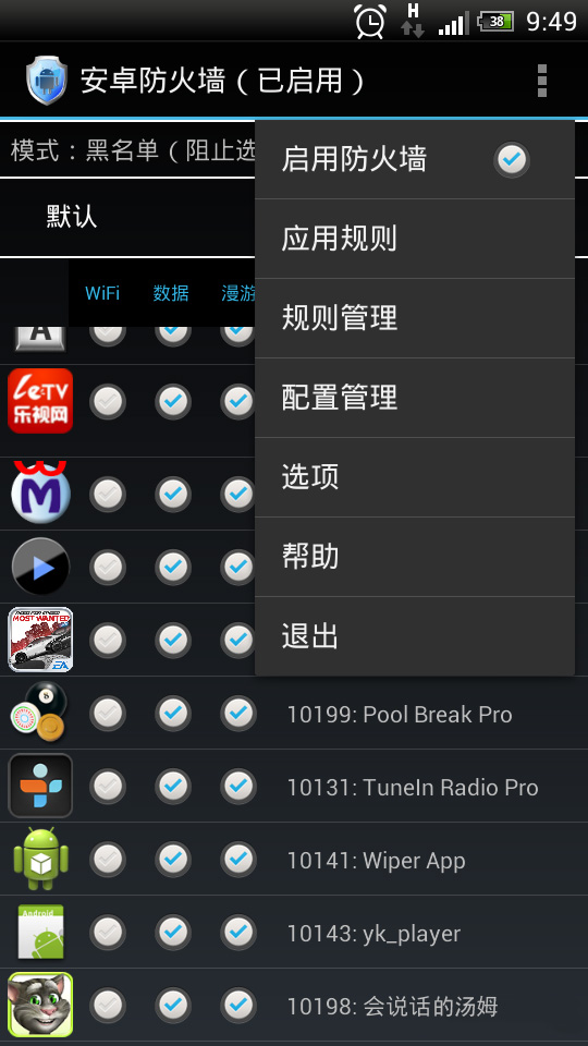 通过手机防火墙安卓版你能够为你的手机进行设置,限制其中的一些程序访问网络。比如有些恶意程序或者带有后门的程序,会偷偷的连接网络,进行各种资料的交换,这些都是你的潜在的威胁,而只要在DroidWall里面将该可以软件拉入黑名单,就能够有效的防止它访问网络了。这是一个完美的解决方案,而且它对你的电池电量并没有太大的损耗,绝对值得你拥有。
