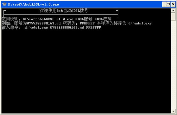 如:程序在D盘,文件名为:ADSL.exe ADSL账号:abc ADSL密码:123
