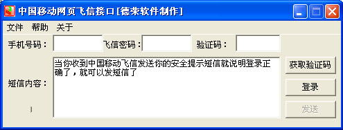 移动网页飞信接口用于中国移动通信开通了飞信功能的用户使用,用于自动登录网页飞信并免费向手机发送短信。移动网页飞信接口免安装,自动记忆用户信息,一键登录移动飞信,简单易用,很方便的应用到其它方面。