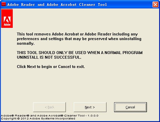 Adobe Reader and Adobe Acrobat Cleaner Tool 是由 Adobe 官方出品的专用卸载工具,可以用来强制卸载掉 Adobe Reader 与 Adobe Acrobat 产品,解决无法重新安装的问题。