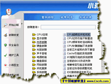 一款模拟专家真人上门电脑故障诊断、排除和维修的软件。采用了人性化设计和针对初学者而设计的傻瓜式菜单界面。对于不能解决的疑难故障,还可以使用在线诊断功能,在线诊断分析。软件主要有以下功能:【故障诊断】采用智能诊断和手动诊断功能,帮助您一步一步找出故障所在。并解决故障。【自动修复】可以自动修复常见、疑难、上网等系列电脑故障和系统优化设置系统,发挥电脑浅能,使电脑更快速更安全。【电脑词典】查询常见的电脑中、英文术语、词汇和电脑常见的技巧、备忘资料等。【维护工具】电脑常用故障所需的维护工具、病毒专杀工具和家庭、企业常用工具等。【教学录像】大量的电脑故障排除、使用技巧、软件教程录像供您学习。