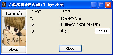 失落战机4修改器是同名飞行射击游戏《失落战机4》辅助工具。失落战机4修改器功能:F1 锁定4条人命 F2 锁定无敌满血锁定 F3 积分无限,修改为指定值