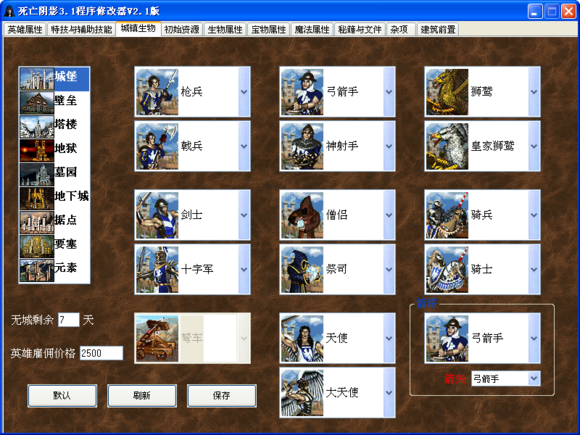 可以修改每个城镇可以招聘的生物。注意箭塔生物必需会射击,否则会出错。
