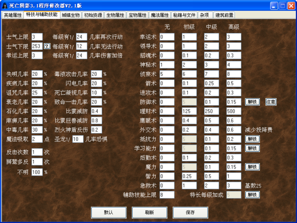 包括基本属性,学会所有魔法,修改兵种,修改辅助技能。