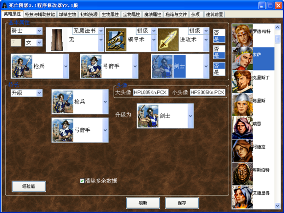 英雄属性这里可以修改英雄的初始属性和特长以及头像文件名。