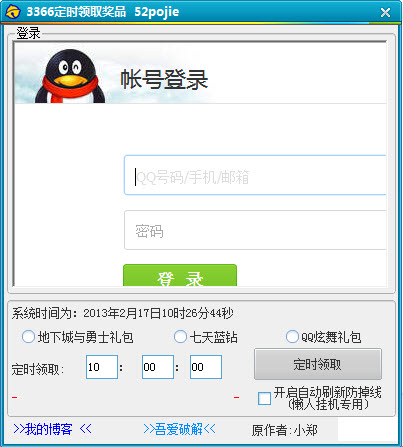 3366定时抢礼包工具 1.0 绿色免费版 3366定时抢礼包工具:定时领取3366奖品,可兑换QQ黑钻 QQ蓝钻 紫钻。