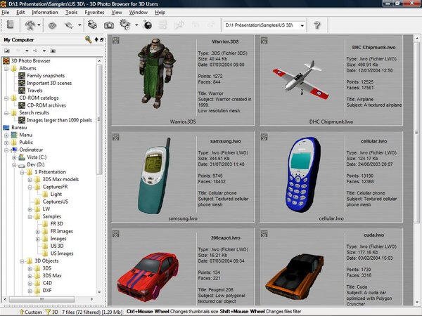 3D Browser是一套强大的2D及3D图片文件浏览器。它会建立目录,并包含了缩图、关键自、作者资讯、以及评注。3D browser并且具有许多的功能,诸如档案搜寻、目录列印、幻灯片显示功能、快速的应用程式存取等。这套软体并且能够辨识psd、 tga、 jpg、 gif、 iff、 tiff、 bmp.......等2D档案,以及3DS Max、 Lightwave、 Truespace、 3D studio、 Amapi等3D档案。为了能够快速的浏览你的档案,这套软体并内建了一个强大的2D及3D浏览器。也能够经由浏览器来作档案转换的工作。它完美了结合视窗介面并拥有漂亮的图形外观。