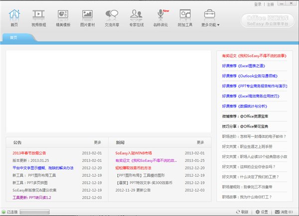 SoEasy办公效率平台,为提供办公人员办公必备工具,是全国最全面、最专业、最实用的办公辅助工具,专为提升办公能力,及办公效率的学习平台,由数名微软金牌讲师、资深顾问等组成的专家团队,以快速提升个人工作效率、简化工作内容、提升文档专业度作为目标,功能包括专家在线答疑、办公软件技巧提升、海量素材、模板、办公常用工具集、在线培训视频等,是目前内容最全、功能最丰富、信息最集中,协助办公人员改变现有陈旧的工作模式,将更多时间专注在工作内容。