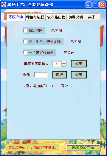 农场工艺全功能修改器具有锁定时间,水肥料种子无限,一个果实就满箱,金币数量无限等功能,它是模拟经营游戏《农场工艺》的作弊器和辅助工具。