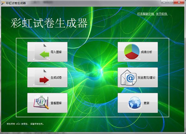 彩虹试卷生成器 2.2 官方安装版 彩虹试卷生成器是一个辅助教学的工具软件,方便教师在考核学生的试卷试题上实现自动生成试卷,本软件可以在试题库的基础上自动按要求生成试卷,还可以对试卷进行分析。对于教师来说,是一个非常有用的工具软件,适用于小学至高中,乃至大学试卷出题工作。