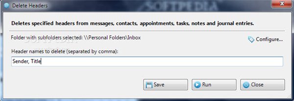 删除页眉是Microsoft Outlook加载项,可让您扫描整个文件夹,并删除某些头元素的所有消息。您也可以从其他项目,如联系人,约会,任务,便笺和日记条目中删除的头。在运行扫描之前,您需要选择的文件夹,并输入要删除的标头项目。
