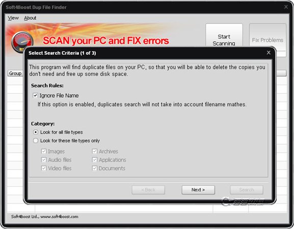soft4boost DUP文件的MD5搜索引擎允许程序来搜索内容重复的文件,不管其他比赛标准。这将是有益的,例如,当两个相同的MP3曲目或视频文件有不同的名字。