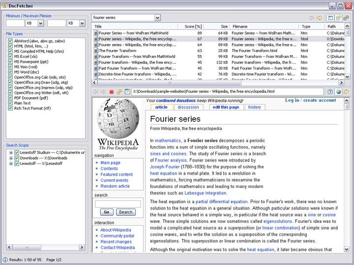 DocFetcher 支持搜索的文档格式非常丰富,如:网页(html),文本文档 (txt),PDF,chm,rtf,Office文档 (doc、xls、ppt、docx、 xlsx、 pptx),OpenOffice (odt、ods、odg、odp),AbiWord (abw、abw.gz、zabw),Visio (vsd),svg 等等,基本上流行的文档都能被索引和搜索,应该能满足绝大部分人的需求了。