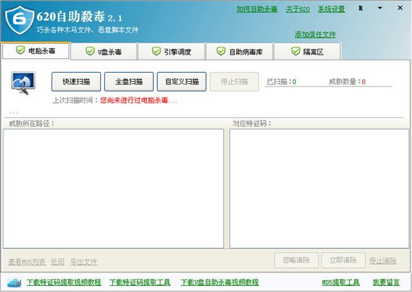 620自助杀毒工具,准确查杀病毒木马、恶意程序,可让用户自由定义查毒对象,针对性强,杀毒灵活,人人都可以真正自己来杀毒,体验杀毒的乐趣和安全成果