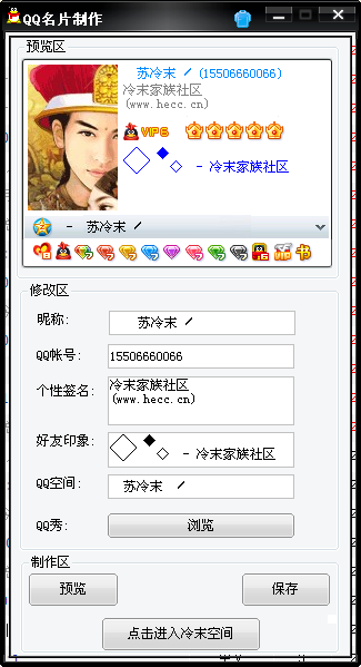 软件介绍由苏冷末制作的QQ名片制作工具,绝对是耍酷必备软件,使用方法也很见到那,直接修改保存即可,有预览区显示,方便你更好的设计。 可修改范围: 昵称、QQ帐号、个性签名、好友印象、QQ空间、QQ秀。