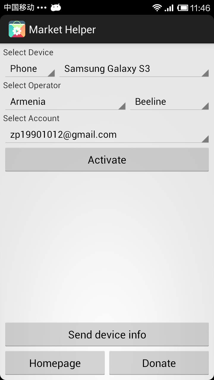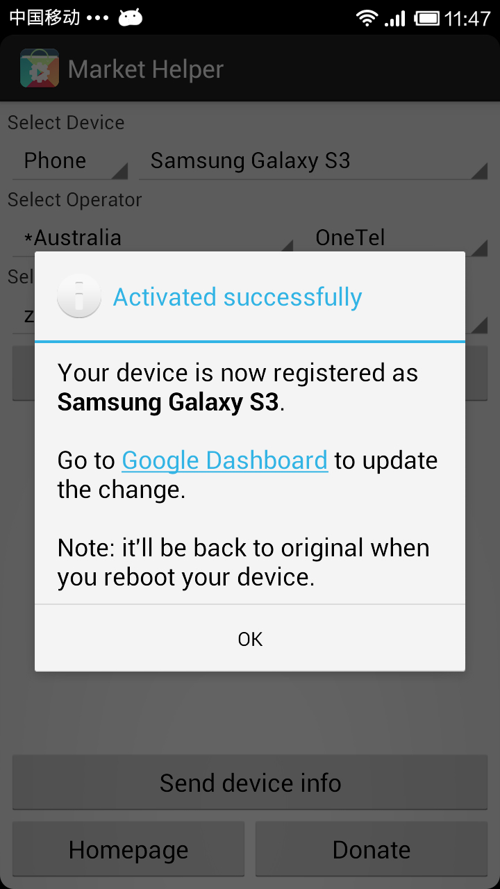 谷歌电子市场助手是一款可以帮你更改手机运营商以及修改机型型号配置文件build.prop的软件,它操作起来更加简便,并且可以随时换回设备的原有配置,避免出现一些不必要的问题。目前这款应用仅支持将设备模拟成GalaxyS3,kindleFireHD,AmazonKindle以及Nexus7四款设备(更多的设备会在后期陆续添加),后三者均为平板设备。