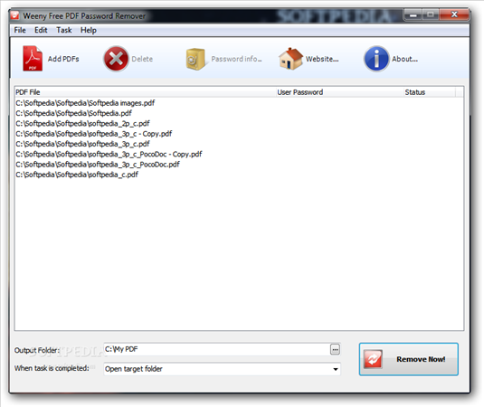Weeny Free PDF Password Remover 1.1 官方英文版 移除PDF文件保护(Weeny Free PDF Password Remover)PDF 文件可以设置保全项目,像是禁止复制文件内容、开启时有密码保护、禁止列印......等等的保护措施,想要解除 PDF 文件所设的限制,可以来使用 Weeny Free PDF Password Remover 这套免费软体来移除这些保全措施。