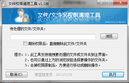 再说下用法吧,支持拖拽文件或文件夹到主界面,也支持通过浏览按钮来选择目录,清理完权限之后,对于目录的操作也就比较随意了,当然,也可以通过勾选来直接对顽固目录执行删除操作。