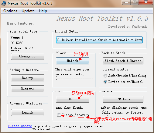 Nexus Root Toolkit教程:安装完成后会弹出一个提示窗,大致意思是让你进入平板的设置界面,点击关于平板7次,会出现开发者选项,进入开发者模式勾选USB调式选项.
